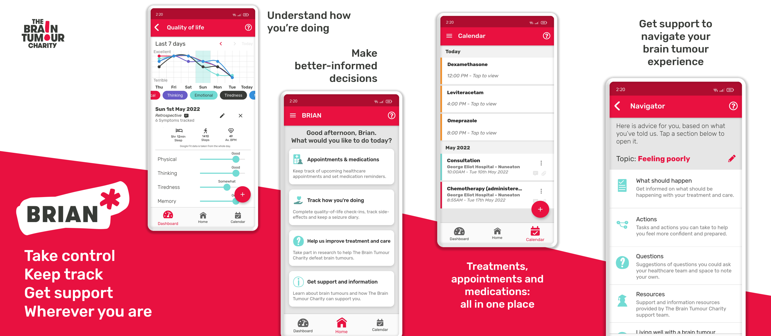 BRIAN (the Brain tumouR Information and Analysis Network) is an web-based and mobile app developed by The Brain Tumour Charity to help people cope with a brain tumour. The app allows users to record details about their experience, including appointments and treatments, medications, and side-effects. Users can also complete daily Quality of Life “check-ins” and complete Questionnaires to help with research.